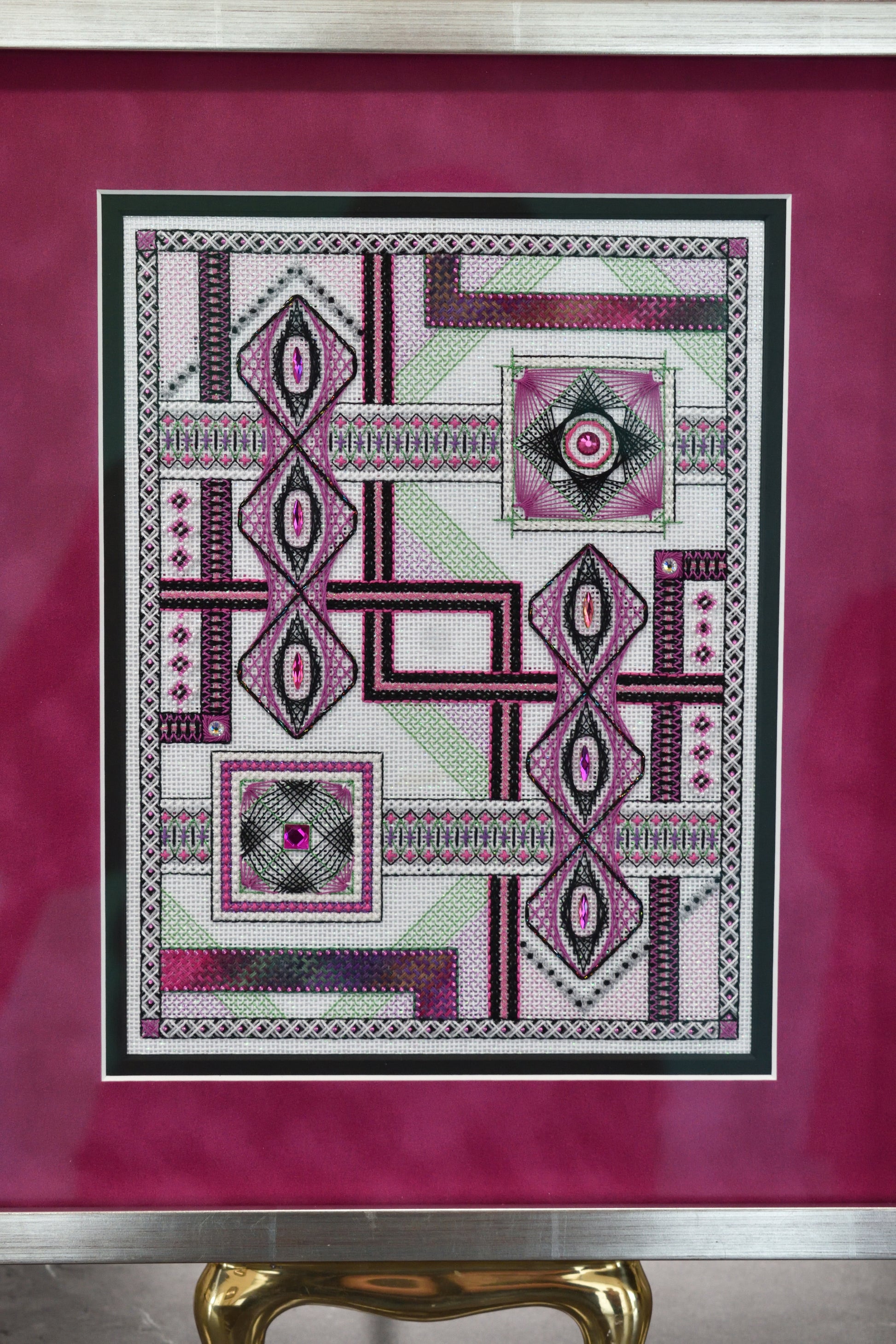 Mystic Convergence is an interpretation of Aristotle’s quote – “The whole is greater than the sum of its parts”. Simple to complex line designs are interwoven to create an intriguing sampler that will challenge and delight the stitcher. The brights version is a "Wow" piece of stitchery. Perfect for those who aren't afraid of color!